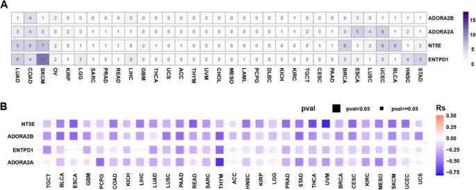 结果解读:腺苷通路成分的基因突变频率低(除皮肤黑色素瘤、结肠癌外),dysregulation主要由表观遗传修饰驱动(如HIF1α激活CD39/CD73转录);部分癌症(如膀胱癌、胸腺瘤)显示通路成分低甲基化,可能对靶向治疗更敏感(图2,