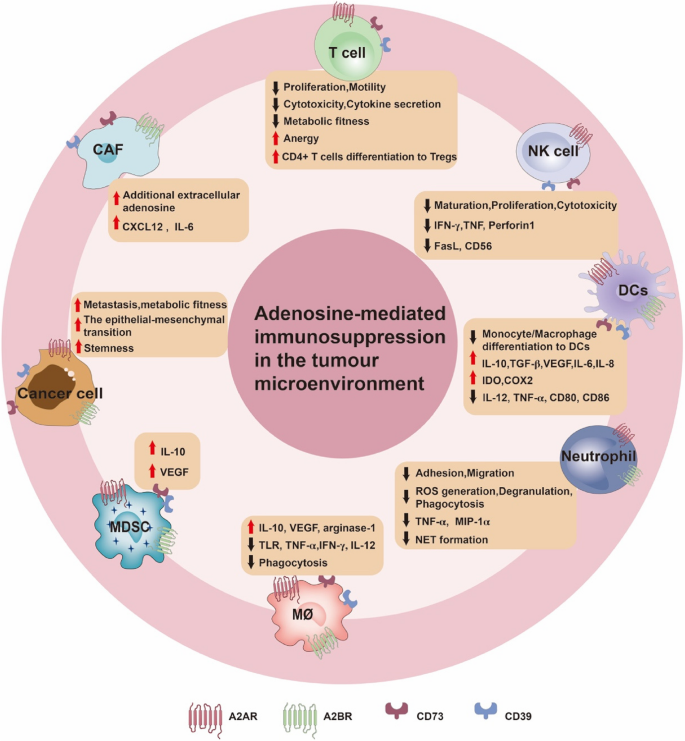 方法细节:通过文献综述总结腺苷对免疫细胞(T细胞、NK细胞)、肿瘤细胞(EMT、干细胞特性)、基质细胞(CAFs)的调控机制。