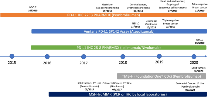 - 图1:FDA批准肿瘤免疫治疗生物标志物的时间线(如2011年ipilimumab获批,2017年pembrolizumab获批MSI-H适应症)