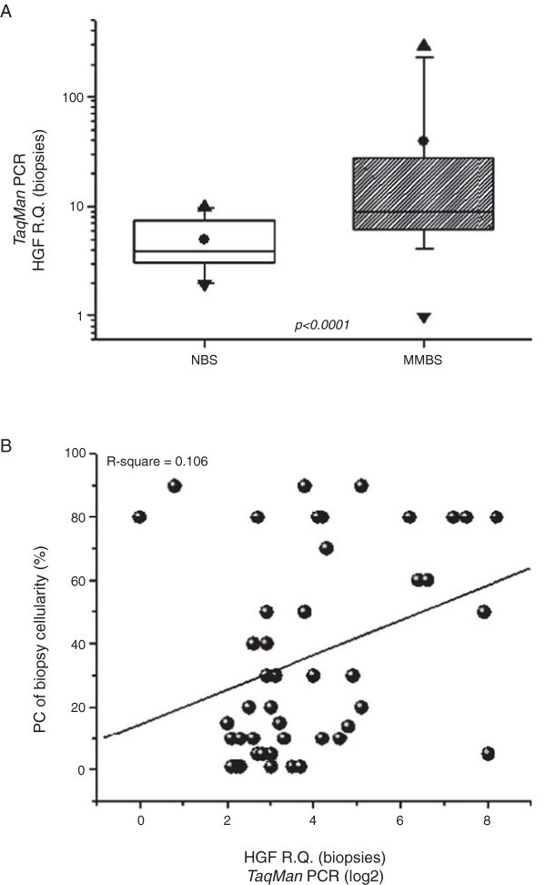 方法细节:分析46例MM患者骨髓活检HGF mRNA与对应CD138+细胞mRNA的相关性,及29例患者CD138+细胞mRNA与血清HGF蛋白(R&D DuoSet ELISA Development Kit检测)的相关性。