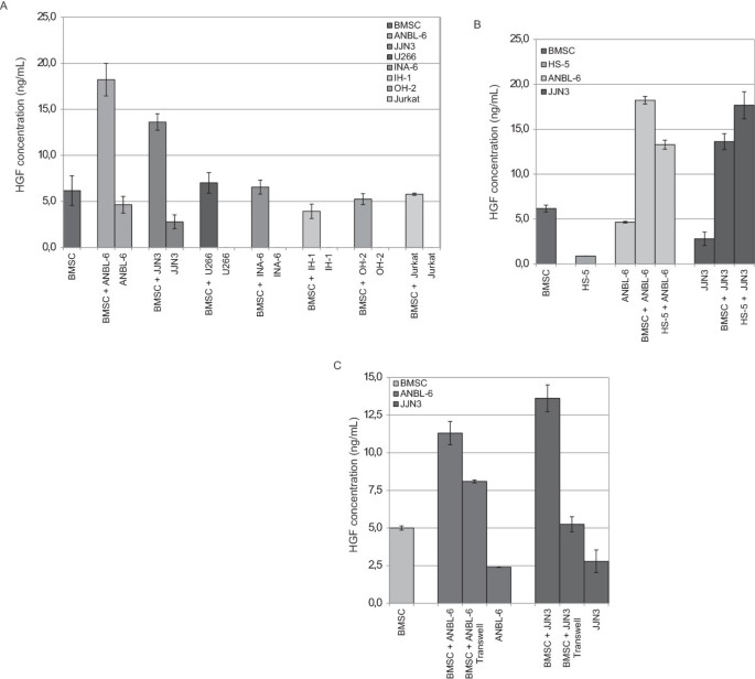 方法细节:将MM细胞系(ANBL-6、JJN3、U266)与BMSC或HS-5细胞(永生化骨髓基质细胞系)共培养48小时,或用Transwell小室(仅允许可溶性因子通过)分离培养,ELISA检测上清HGF水平。