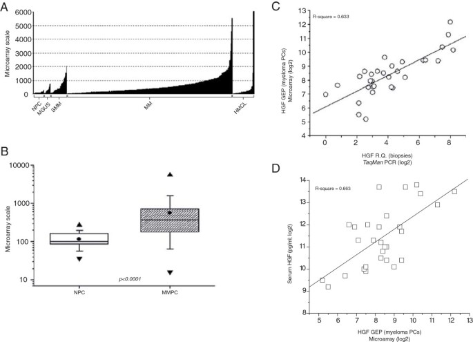 方法细节:收集19例健康人、46例MM患者的骨髓活检样本(提取RNA用Qiagen RNeasy Fibrous Tissue Kit),及22例健康人、14例意义未明单克隆丙种球蛋白病(MGUS)、34例冒烟型MM(SMM)、344例MM患者、45株MM细胞系的CD138+细胞(提取核酸用Qiagen AllPrep DNA/RNA Mini Kit);通过Affymetrix U133Plus2.0微阵列芯片分析CD138+细胞HGF基因表达谱,并用Life Technologies High Capacity RNA-to-CDNA Kit反转录、TaqMan探针(HGF: Hs00379140_m1;内参GAPDH: Hs99999905_m1)实时PCR验证骨髓活检样本HGF mRNA水平。