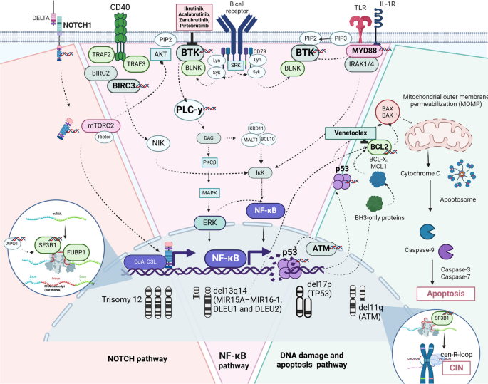 文献综述的核心评述逻辑按“信号通路分类→异常机制→治疗策略→耐药机制”维度组织,涵盖BCR通路、NF-κB通路、PI3K/AKT通路、ROR1通路、凋亡通路(BCL2家族)、DNA损伤修复通路(TP53、ATM)、RNA剪接通路(SF3B1)、炎症通路(MYD88)、NOTCH1通路等9类关键通路。
