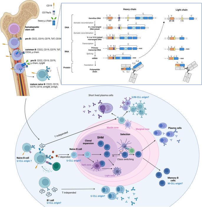 Fig.1 展示B细胞分化过程中CLL的潜在起源: