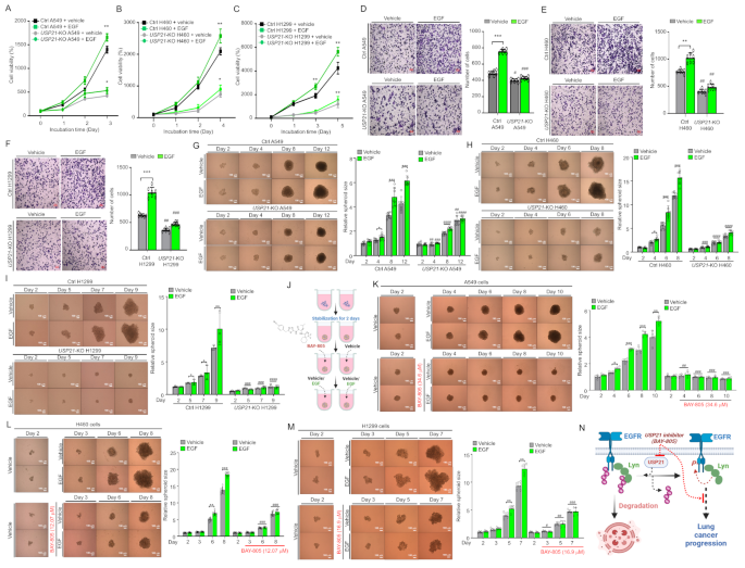 实验目的是评估USP21抑制剂BAY-805对EGF诱导的NSCLC细胞增殖和 spheroid形成的抑制作用。方法细节为:①细胞培养:将A549、H460、H1299细胞接种于96孔板,培养48小时形成稳定的3D spheroid;②预处理:用vehicle(DMSO)或BAY-805(浓度为各细胞系的IC₅₀:A549为34.6μM,H460为12.07μM,H1299为16.9μM)预处理24小时;③EGF处理:加入EGF(10ng/mL),继续培养48小时;④检测:用ImageJ软件测量spheroid大小,统计均值。