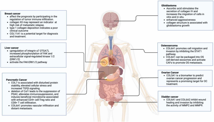 方法细节:回顾体内外研究(CRC细胞模型、乳腺癌异种移植模型、临床样本免疫组化),重点分析胶原蛋白合成(COL1A1基因)、降解(MMPs)及交联(LOX)的机制。