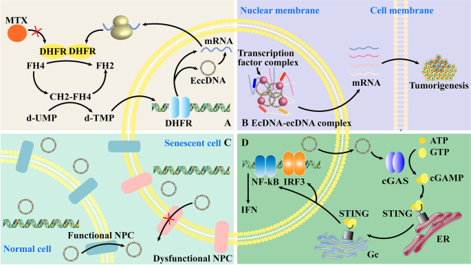3. 诱导细胞衰老:正常细胞通过核孔复合物(NPCs)排出eccDNA,而衰老细胞NPCs功能障碍,导致eccDNA核内积累,成为衰老标志物(Qiu等2021年研究)。
