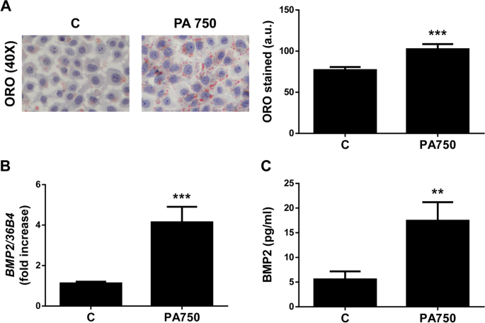 方法细节:培养人肝癌细胞系Huh7(ATCC),用750μM棕榈酸(PA,Merk Millipore)处理16小时(模拟肝脏脂肪变性),对照组用等体积异丙醇处理。通过油红O染色(Merk Millipore)检测细胞内脂质积累,逆转录定量聚合酶链反应检测BMP2 mRNA水平,酶联免疫吸附测定检测细胞上清BMP2浓度。