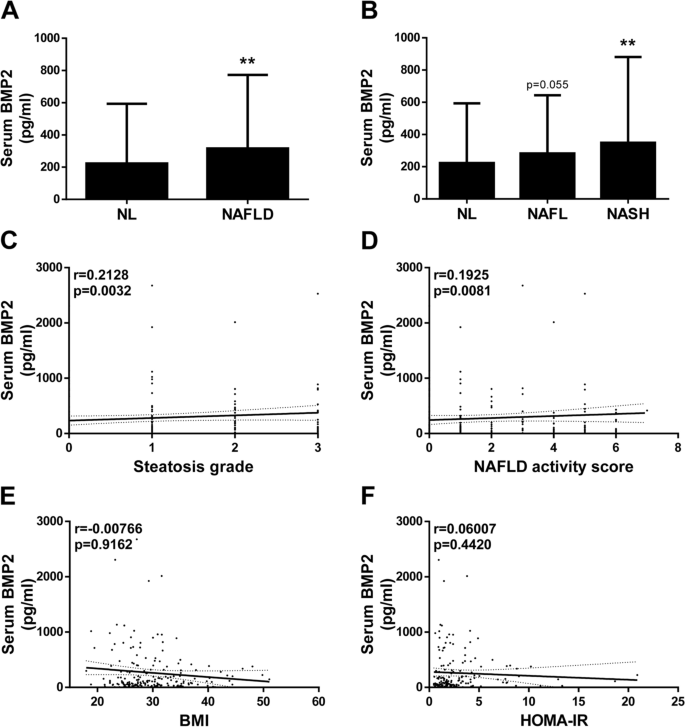 结果解读:NAFLD患者肝组织BMP2 mRNA水平较NL组高2倍(n=115 vs 75,P<0.0002),且NASH患者肝BMP2水平显著高于NAFL患者(P<0.01);血清BMP2浓度在NAFLD患者中显著升高(P=0.0033),且与肝组织steatosis分级(P=0.0032)、NAFLD活动评分(P=0.0081)正相关,但与BMI、HOMA-IR无关联(P>0.05)。
