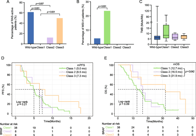 - 1类BRAF突变:是不良预后Biomarker(中位OS 12.7个月,P<0.05),与RNF43突变、MSI-H、高TMB显著相关(P<0.05);