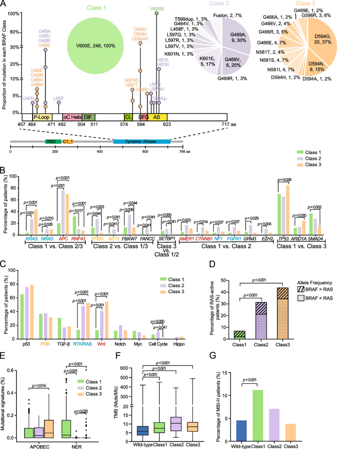 本环节目标是比较1/2/3类BRAF突变的基因组差异。研究通过分析基因突频率、通路改变、RAS激活突变等位频率(AF)、突变特征(COSMIC数据库)、TMB(肿瘤突变负荷)及MSI(微卫星不稳定),得出以下结论: