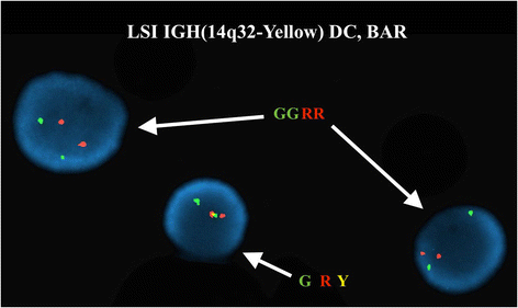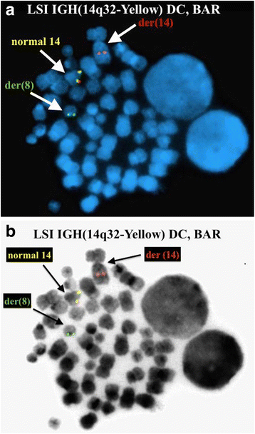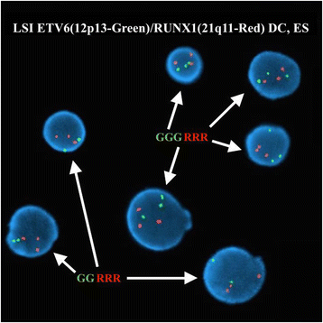 实验目的:确认ETV6和IGH@基因的重排情况。方法细节:使用Abbott Molecular的荧光原位杂交探针(ETV6/RUNX1双color易位探针、ETV6 break apart探针、IGH@ break apart探针等),检测300个间期核和中期分裂相的信号模式。结果解读:ETV6/RUNX1探针显示50.7%(152/300)间期核有3个ETV6信号,提示ETV6重排;ETV6 break apart探针在中期分裂相显示,正常12号染色体有ETV6融合信号(F),der(2)有ETV6 5′端(红色),der(12)有ETV6 3′端(绿色),确认t(2;12)涉及ETV6;IGH@ break apart探针显示89.7%(269/300)间期核有1个融合信号(正常IGH@)和1个分裂信号(t(8;14)导致的重排),6.7%(20/300)间期核有2个分裂信号(双等位基因IGH@重排);中期分裂相确认t(8;14)中der(8)携带IGH@ 3′端(红色),der(14)携带IGH@ 5′端(绿色)。对应图2(ETV6间期信号)、图3(ETV6中期信号)、图4(IGH@间期信号)、图5(IGH@中期信号)。产品关联:实验所用关键产品:Abbott Molecular的Vysis LSI ETV6/RUNX1 ES Dual Color Translocation Probe Set、Vysis LSI ETV6 Dual Color Break Apart Probe Kit、Vysis LSI IGH Dual Color Break Apart Rearrangement Probe。