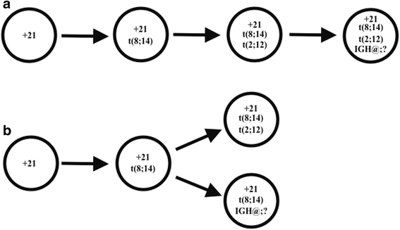 实验目的:解析异常的克隆演化关系。方法细节:结合常规细胞遗传学(中期分裂相异常比例)与荧光原位杂交(间期核异常比例)结果,推测克隆演化模式。结果解读:t(8;14)的间期核阳性率(89.7%)远高于t(2;12)(50.7%)与双等位基因IGH@重排(6.7%),提示t(8;14)是primary异常;t(2;12)与t(8;14)在同一中期分裂相出现,提示其为secondary异常;双等位基因IGH@重排仅在间期核中少量存在,提示为更晚的演化事件。克隆演化可能为两种模式:(1)线性演化:t(8;14)→t(2;12)→双等位基因IGH@重排;(2)发散演化:t(8;14)分别演化出t(2;12)克隆与双等位基因IGH@重排克隆。对应图6(克隆演化模式图)。产品关联:文献未提及具体实验产品,领域常规使用荧光原位杂交图像分析软件(如MetaSystems ISIS)。