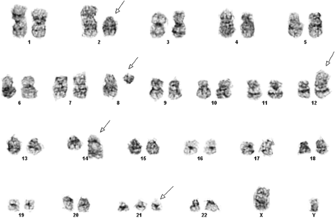 实验目的:检测染色体数目与结构异常。方法细节:取骨髓和外周血样本制备30个中期分裂相,经G显带(Giemsa显带)处理后,用Applied Imaging CytoVision软件进行核型分析,按ISCN 2013标准命名。结果解读:25个分裂相为47,XY,+21c(唐氏综合征核型),5个分裂相为47,XY,+21c,t(2;12)(p12;p13),t(8;14)(q11.2;q32),提示存在额外易位。对应图1(异常核型)。产品关联:实验所用关键产品:Applied Imaging CytoVision软件(核型分析)。