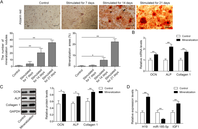 方法细节:采用小鼠前成骨细胞MC3T3-E1,分为对照组(α-MEM培养基)和矿化组(含10⁻⁸M地塞米松、50mg/L抗坏血酸、10mM β-甘油磷酸的α-MEM培养基),每3天换液,分别在培养7、14、21天后检测矿化指标。通过茜素红染色观察矿化结节,qPCR和Western blot检测矿化标志物(骨钙素OCN、碱性磷酸酶ALP、Ⅰ型胶原蛋白Col1a2)的mRNA和蛋白水平,qPCR检测H19、miR-185-5p和IGF1的表达。