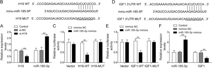 结果解读:starBase预测H19与miR-185-5p存在互补结合位点(图3b);miR-185-5p mimics显著抑制H19-WT的荧光素酶活性,但对H19-MUT无影响(图3c,n=3,P<0.01);H19敲低后miR-185-5p水平显著上调(图3a,n=3,P<0.01)。