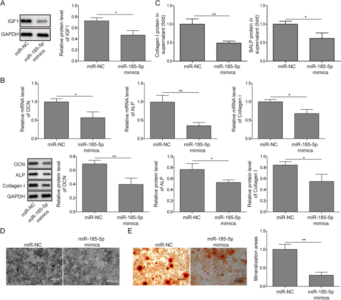 方法细节:用miR-185-5p mimics或miR-NC转染MC3T3-E1细胞,Western blot检测IGF1蛋白水平;qPCR和Western blot检测矿化标志物的mRNA和蛋白水平;ELISA检测细胞上清中Col1a2和BALP的水平;ALP染色和茜素红染色检测矿化表型。