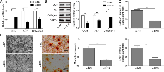 方法细节:用小干扰RNA(si-H19)或阴性对照(si-NC)转染MC3T3-E1细胞,qPCR检测H19敲低效率;qPCR和Western blot检测矿化标志物的mRNA和蛋白水平;ELISA检测细胞上清中Col1a2和骨特异性ALP(BALP)的水平;ALP染色检测ALP活性;茜素红染色检测矿化结节。