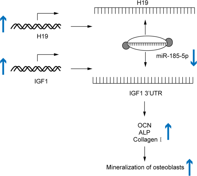 (图6:H19-miR-185-5p-IGF1轴调控成骨细胞基质矿化的机制示意图)