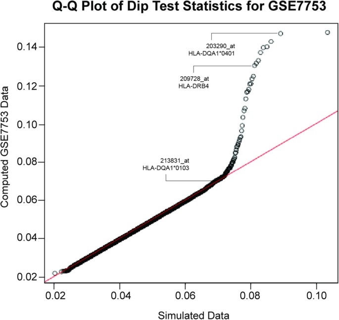 实验目的是从公共微阵列数据集筛选具有双模态表达特征的探针集,作为供体ID标记物的候选。方法细节:使用GSE7753数据集(47个Affymetrix HG-U133_Plus_2微阵列样本,来自系统性幼年特发性关节炎研究),首先通过MAS5算法归一化数据,再过滤强度(要求90th百分位>log₂(6)),最终得到21044个探针集;对每个探针集进行Hartigans’ dip test,模拟1×10⁶次计算经验p值(筛选p<0.001的探针集),同时要求次要等位基因频率<50%(确保标记物的供体区分能力)。结果解读:筛选出多个双模态探针集,其中HLA-DQA1(203290_at、213831_at)和HLA-DRB4(209728_at)的探针集表现突出——图1(Quantile-quantile plot)显示,模拟的单模态数据沿Identity线分布,而候选探针集的dip test结果明显偏离,验证了其双模态特征。产品关联:文献未提及具体实验产品,领域常规使用Affymetrix HG-U133_Plus_2微阵列、R软件(dip test包)进行数据分析。
