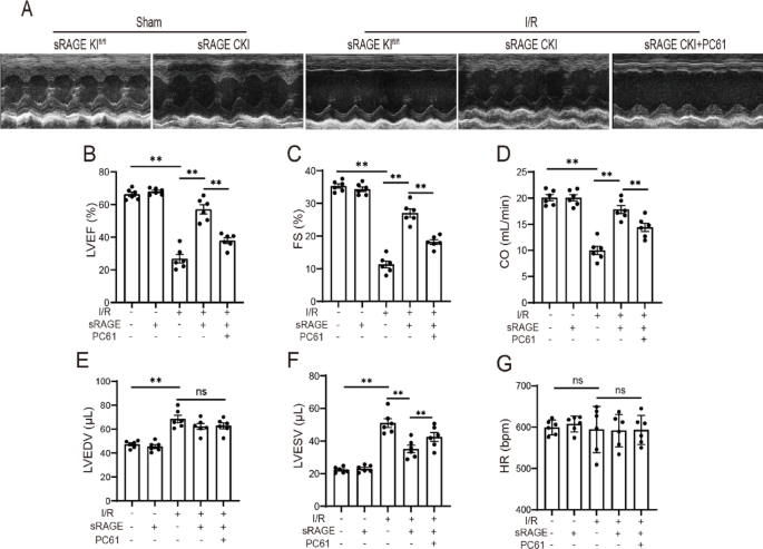 实验目的:验证sRAGE的心脏保护作用及Treg细胞的介导作用。方法:采用经胸超声心动图检测小鼠心脏功能(左心室射血分数LVEF、缩短分数FS、心输出量CO等);TTC染色测定心肌梗死面积。结果:sRAGE过表达显著改善I/R后心脏功能,LVEF从26.83±2.63%升至57.02±2.81%,FS从11.27±1.05%升至27.00±1.26%(图2B-C,n=6,P<0.01);Treg耗竭(腹腔注射抗CD25抗体PC61)后,sRAGE的保护作用被逆转,LVEF降至37.87±1.76%(图2B,n=6,P<0.01)。梗死面积结果显示,sRAGE过表达使梗死面积从28.54±1.24%降至14.12±1.65%,PC61处理后回升至22.36±1.21%(图3A-B,n=6,P<0.01)。