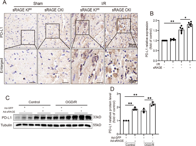 - PD-L1:来源为心肌组织及原代心肌细胞,验证方法为免疫组化及Western blot,结果显示sRAGE过表达使PD-L1表达升高(心肌组织中阳性面积从10.2±1.1%升至22.5±1.5%,n=6,P<0.01)。