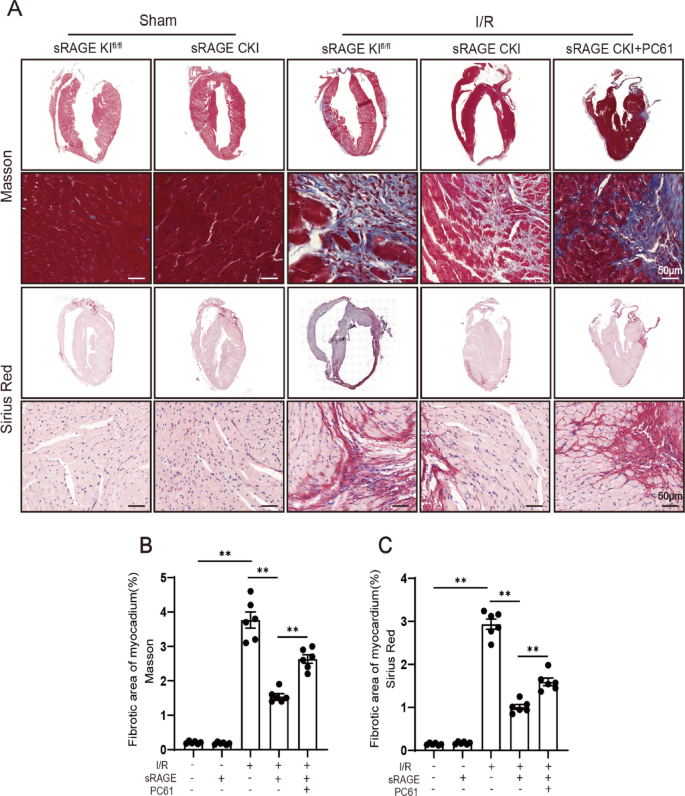 实验目的:探究sRAGE对I/R诱导的细胞死亡及纤维化的抑制作用及Treg的介导作用。方法:TUNEL染色检测心肌细胞凋亡,免疫组化检测cleaved caspase-3表达;Masson三色染色及Sirius红染色评估心肌纤维化。结果:sRAGE过表达显著减少TUNEL阳性细胞(图3C-D,n=6,P<0.01)及cleaved caspase-3表达(图3E-F,n=6,P<0.01);PC61处理逆转了这一效应。纤维化结果显示,sRAGE过表达使Masson染色阳性面积从35.2±2.1%降至18.5±1.5%,Sirius红染色阳性面积从32.1±1.8%降至16.3±1.2%,PC61处理后纤维化面积回升(图4,n=6,P<0.01)。