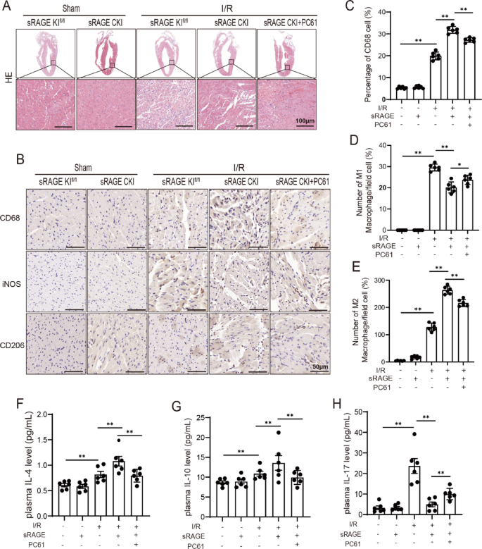 实验目的:验证sRAGE对I/R诱导的炎症反应的抑制作用及Treg的介导作用。方法:HE染色观察心肌组织炎症浸润;免疫组化检测巨噬细胞标志物CD68(总巨噬细胞)、iNOS(M1型)及CD206(M2型);ELISA检测血清中IL-4、IL-10(抗炎)及IL-17(促炎)水平。结果:sRAGE过表达减少炎症细胞浸润(图5A),增加CD206⁺M2巨噬细胞比例(从12.3±1.1%升至25.6±1.5%),减少iNOS⁺M1巨噬细胞比例(从28.5±1.8%降至15.2±1.2%)(图5B-E,n=6,P<0.01);血清中IL-4从15.2±1.0 pg/mL升至32.5±2.1 pg/mL,IL-10从12.1±0.8 pg/mL升至28.3±1.9 pg/mL,IL-17从45.6±2.5 pg/mL降至22.3±1.5 pg/mL(图5F-H,n=6,P<0.01);PC61处理逆转了这些变化。