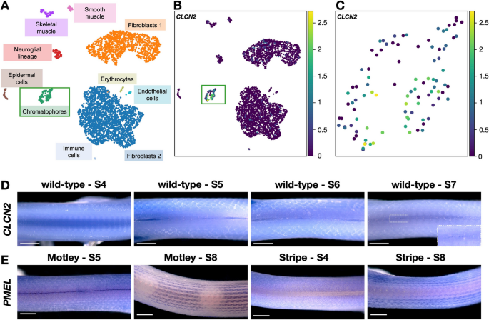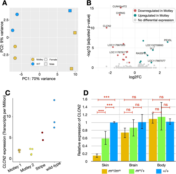 - motley的调控性变异:motley胚胎皮肤中CLCN2表达较野生型低2.31倍(log₂ fold-change=-2.31,adjusted p=8.88×10⁻¹¹,n=4 motley vs 3野生型),导致融合斑块和无腹侧黑斑。