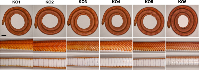 实验目的是验证CLCN2的功能。方法:设计靶向CLCN2插入位点的gRNA,与Cas9共注射到野生型雌蛇卵泡,交配后鉴定突变个体,观察表型。结果:6只敲除个体表现为stripe样表型——背部前半部分条纹、后半部分融合斑块,腹侧无黑斑,随年龄增长红色色素加深,斑块不明显。