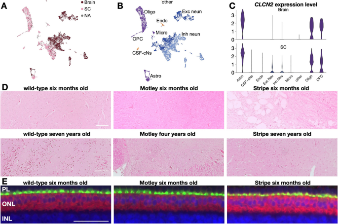 实验目的是确定CLCN2的表达位置及突变的非皮肤影响。方法:(1)单细胞RNA-seq分析野生型胚胎皮肤,鉴定CLCN2的细胞类型;(2)单核RNA-seq分析stripe成体脑;(3)WISH检测胚胎皮肤CLCN2表达;(4)HE染色和免疫组化分析脑、眼。结果:(1)CLCN2仅在胚胎色素细胞祖细胞中表达;(2)CLCN2在脑胶质细胞中表达;(3)stripe幼体脑有空泡化(成体恢复),眼睛视网膜外核层CLCN2表达正常,无退化。