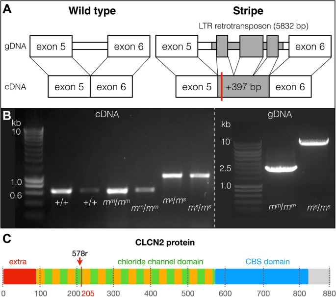 实验目的是解析stripe的分子突变。方法:Sanger测序stripe的CLCN2基因(cDNA和基因组)。结果:stripe的CLCN2内含子5插入5832bp LTR逆转座子,导致cDNA插入397bp,提前终止密码子(第205位氨基酸,野生型880aa),蛋白截断(缺失氯离子通道核心域和CBS调控域)。