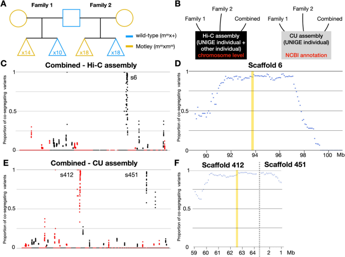 实验目的是定位motley突变的基因组区间。方法:选取两个家系(杂合雄蛇、纯合雌蛇、子代池),提取基因组DNA(QIAGEN DNeasy试剂盒),构建文库后用Illumina HiSeqX/HiSeq2000测序,结合Sanger测序验证重组事件。结果:定位到Scaffold 6的3.4Mb区间,包含CLCN2基因。