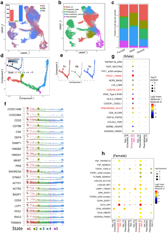 结果:(1)B细胞层面:男性PTC的B细胞数量显著少于女性(5% vs 12%,n=4 vs n=7,P<0.05),且耗竭B细胞、浆母细胞比例更低;伪时间分析显示,女性B细胞的分化节点(状态2→状态4)更完整,男性缺乏该轨迹;(2)T细胞层面:性别差异不显著,仅vd2_gd_T、NK细胞比例略有不同(无统计学意义);(3)互作差异:男性恶性细胞与耗竭B细胞的PDCD1、CD47互作更强(P<0.05),提示男性B细胞的免疫抑制更显著。
