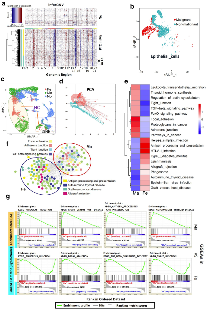 - bulk转录组研究发现,男性PTC富集细胞增殖通路(如TGF-β),女性富集免疫调节通路(如HLA家族);