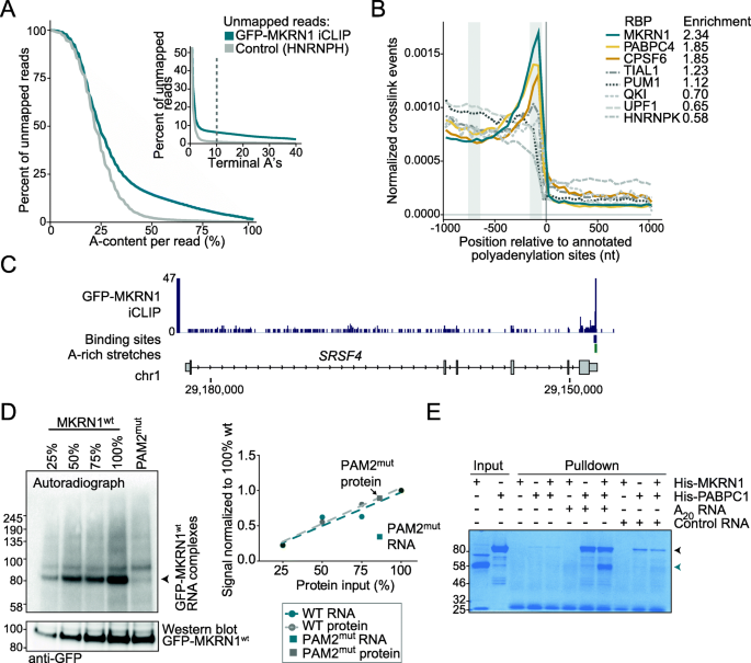结果解读:MKRN1主要结合蛋白质编码mRNA的3" UTR,且前20%的高置信结合位点下游显著富集AAAA四聚体(poly(A)序列特征);PAM2mut导致MKRN1的RNA结合能力下降约70%(Fig.2),表明其RNA结合依赖PABPC1。