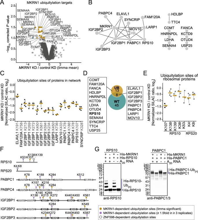 方法细节:1. 泛素remnant profiling:MKRN1敲低细胞中富集di-Gly修饰(泛素化残留)的肽段,通过定量质谱分析差异修饰位点;2. 体外泛素化实验:重组His-MKRN1与His-RPS10/His-PABPC1共孵育,Western blot检测泛素化条带。