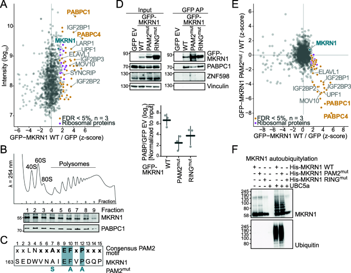 结果解读:MKRN1 wt与PABPC1、PABPC4(多聚腺苷酸结合蛋白)、RPS10(核糖体蛋白)等显著互作;PAM2mut几乎完全丧失与PABPC1的结合,且互作组明显改变;RINGmut仍保留与PABPC1的互作(Fig.1)。