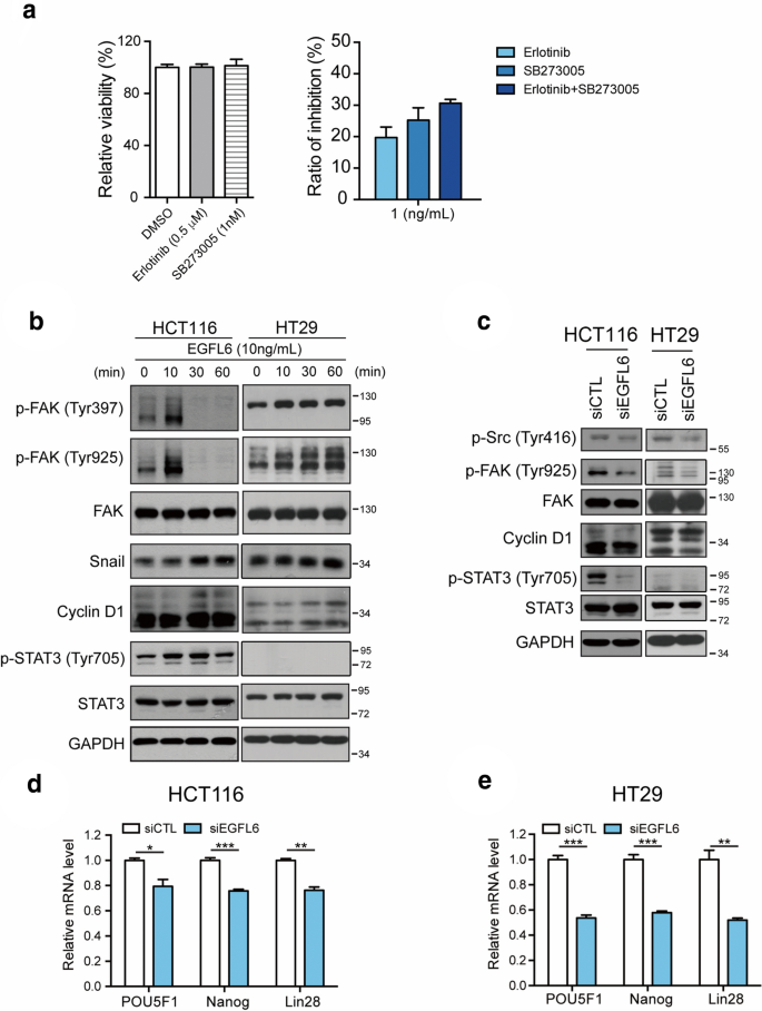 方法细节:① 用EGFR抑制剂(厄洛替尼,10 μM)、αvβ3整合素抑制剂(SB273005,10 μM)处理细胞,检测重组EGFL6诱导的增殖;② Western blot检测FAK(Tyr397/925)、Src(Tyr416)、STAT3(Tyr705)的磷酸化水平,及Cyclin D1、Snail的表达;③ qPCR检测干细胞基因(POU5F1、NANOG、LIN28)的mRNA水平。