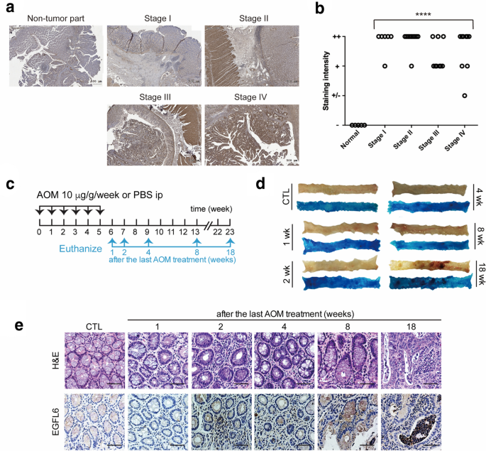 结果解读:① 临床样本中,EGFL6在I-IV期肿瘤组织中高表达(“++”评分),正常组织无表达(p<0.0001);② AOM小鼠模型中,EGFL6在8周(息肉形成)时开始表达,18周(肿瘤进展)时表达显著增加(图1)。