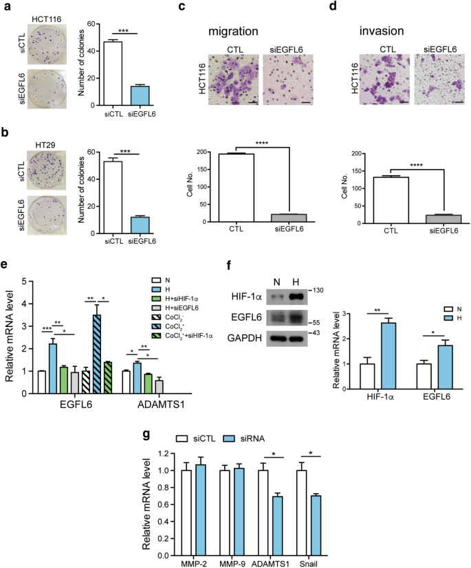结果解读:① 敲低EGFL6减少集落形成(p<0.05)、迁移(细胞数减少50%,p<0.05)和侵袭(细胞数减少60%,p<0.05);② 缺氧诱导EGFL6表达(依赖HIF-1α,siHIF-1α可抑制);③ 敲低EGFL6降低ADAMTS1、Snail的mRNA水平(p<0.05)(图3)。