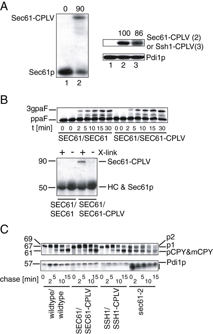 方法细节:构建SEC61/SEC61-CPLV和SSH1/SSH1-CPLV异源二倍体(通过整合质粒转化二倍体酵母);通过定量免疫印迹(抗Sec61p N端抗体)检测融合蛋白与野生型蛋白的表达水平;通过体外ER导入实验(^{35}S标记的preproalpha factor,检测其信号肽切割和糖基化产物3gpaF)验证转运功能;通过化学交联实验(DSP交联后抗Sec63p免疫沉淀)检测Sec61-CPLV与Sec63复合体的结合。