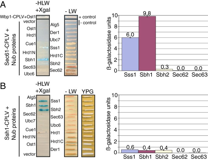 结果解读:报告基因实验显示,Sec61-CPLV与Nub-Sss1p(Sec61复合体辅助亚基)、Nub-Sbh1p(Sec61复合体辅助亚基)强相互作用(无组氨酸培养基生长,X-gal蓝染),与Nub-Sbh2p(Ssh1复合体辅助亚基)弱相互作用;Ssh1-CPLV与Nub-Sss1p、Nub-Sbh1p、Nub-Sbh2p的相互作用强度相当(无组氨酸生长和X-gal染色无差异)。PLV切割实验更敏感,显示Sec61-CPLV与Nub-Sec62p(Sec63复合体亚基)、Ost1p-Nub(寡糖基转移酶亚基)存在弱相互作用,而Ssh1-CPLV与Nub-Sec62p也有弱相互作用——这些弱相互作用未达到报告基因的激活阈值,但通过直接检测PLV切割得以捕捉。