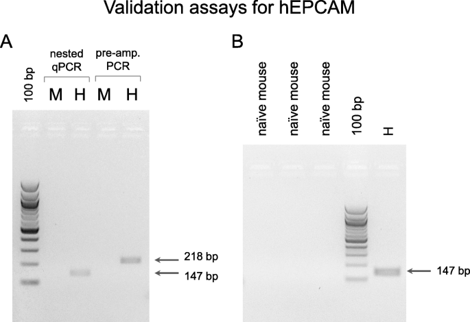 结果解读:引物能特异性扩增人类细胞系的目标基因(如EPCAM在人类细胞系中出现预期大小的条带),而naive小鼠血液中无扩增产物(图1),证明引物具有严格的人类特异性,无小鼠基因交叉反应。