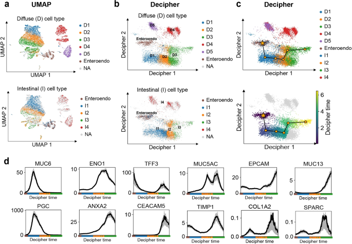 结果解读:(1)Decipher 1轴对应肿瘤进展:从非恶性肠内分泌细胞到恶性I3/D3阶段,MUC6(正常腺粘液细胞标志物)的表达下降,ENO1(中间阶段标志物)、MUC13(恶性标志物)的表达上升(图7d);(2)Decipher 2轴对应弥漫型胃癌的严重偏离:弥漫型恶性细胞(D4)集中在Decipher 2轴的高值区域(图7b)。