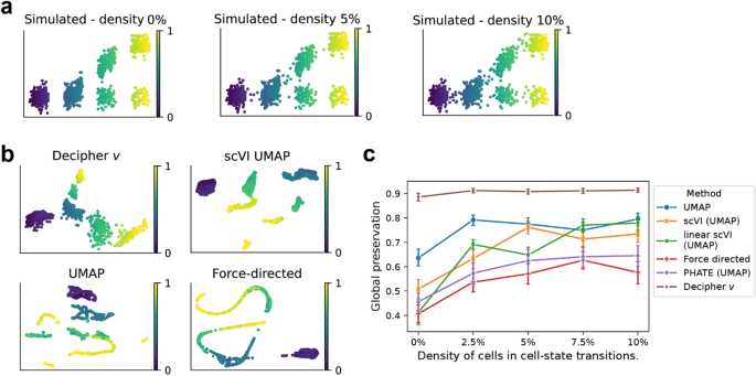 结果解读:Decipher在低采样密度区域仍能保留轨迹的全局顺序——例如,模拟数据中分叉轨迹的起始细胞(星号)与终止细胞(圆圈)在Decipher空间中保持正确位置(图2b);全局保存 metric显示,Decipher在所有采样密度下均优于其他方法(图2c)。
