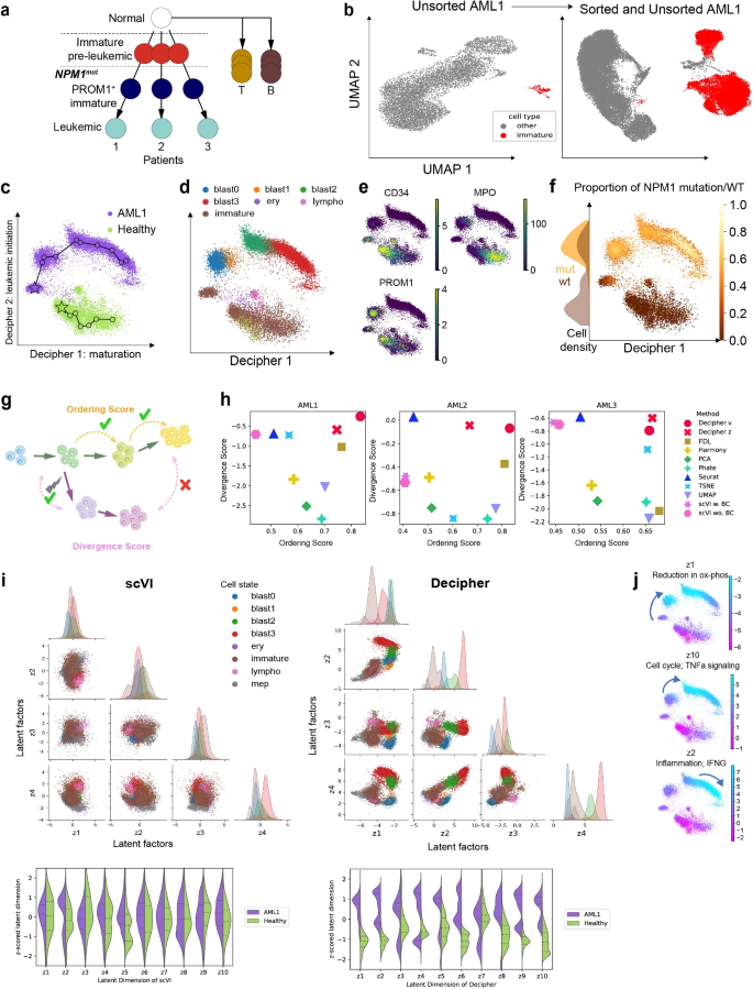 结果解读:Decipher空间(v)可直接可视化细胞状态的全局结构——例如,AML数据中v1轴对应细胞成熟(从immature到blast3),v2轴对应疾病偏离(区分健康与白血病细胞);latent factors(z)可细化细胞状态——例如,z6在胰腺癌数据中区分KRAS突变细胞(图3b)。