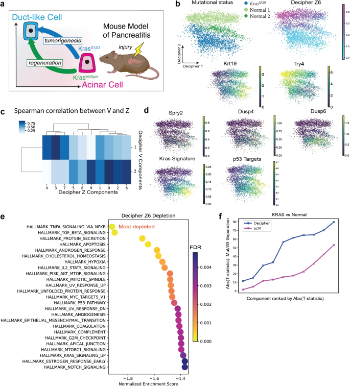 结果解读:(1)Decipher 1轴对应腺泡→导管化生(ADM):腺泡标志物Try4的表达随Decipher 1轴增加而下降,导管标志物Krt19的表达上升(图3b);(2)Decipher 2轴对应KRAS突变导致的偏离:KRAS突变细胞集中在Decipher 2轴的高值区域(图3b);(3)latent factor z6区分KRAS突变细胞:z6与Decipher 2轴强相关(Pearson相关系数=0.81,n=5000,P<0.001),其相关基因包括KRAS靶点Dusp6、Dusp4(图3d),GSEA显示z6富集TNF、TGFB等肿瘤相关通路(图3e)。
