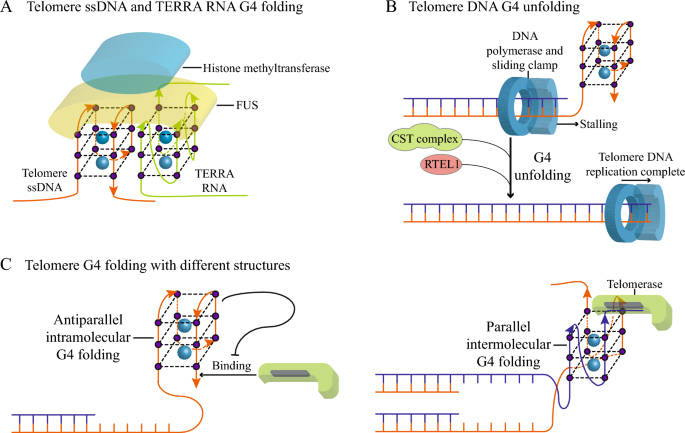 方法细节:作者通过“转录调控”“端粒稳态”“基因组稳定性”三个方向解析功能:(1)转录调控:利用ChIP-seq检测G4与转录因子的结合,通过RNA-seq分析G4稳定剂处理后的基因表达变化,结合报告基因实验验证G4对转录的影响;(2)端粒稳态:通过荧光原位杂交(FISH)检测端粒长度,利用免疫荧光观察端粒G4的积累,结合端粒酶活性测定分析G4对端粒延伸的影响;(3)基因组稳定性:通过彗星实验检测DNA损伤,利用i-BLESS技术检测G4相关的双链断裂(DSB),结合复制叉追踪实验分析G4对复制的影响。