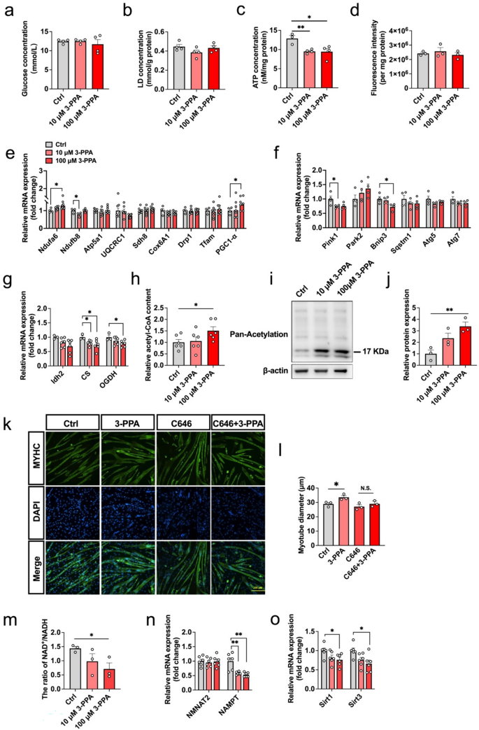 实验目的是解析3-PPA对能量代谢及蛋白乙酰化的影响。方法为:检测NAD⁺/NADH比值(Beyotime试剂盒)、乙酰-CoA含量(Solarbio试剂盒)、三羧酸循环(TCA)关键基因(CS、OGDH)的mRNA表达(qPCR)、总蛋白乙酰化水平(Western blot);通过添加乙酰转移酶抑制剂C646(10μM)验证乙酰化的必要性。结果显示:3-PPA处理后,NAD⁺/NADH比值降低50%(n=3,P<0.05),乙酰-CoA含量增加2.3倍(n=6,P<0.01);TCA循环基因CS和OGDH的mRNA表达分别降低40%和35%(n=6,P<0.05);总蛋白乙酰化水平增加2.1倍(n=3,P<0.05)。C646处理后,3-PPA诱导的肌管直径增加效应消失(n=3,P>0.05)。实验所用关键产品:NAD⁺检测试剂盒(Beyotime,货号S0175)、乙酰-CoA试剂盒(Solarbio,货号BC0980)、C646(Sigma-Aldrich)。